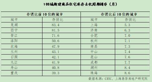 此外,报告显示,上海成为2022年楼市去库存最好城市,从排序可以看出,包括上海、济南和合肥的去化速度相对较好,存销比分别为5.3个月、6.3个月和7.0个月。值得关注的是,全国100个城市中,有39个城市去库存周期超过24个月,即两年。比如,重庆、北海、洛阳分别为39.3个月、47.9个月、50.6个月 。