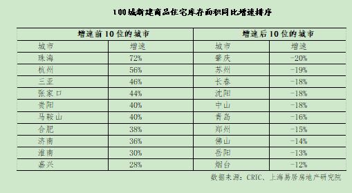 通过报告横向对比可以看出,2022年全国百城库存攀升的城市数量较多,约占7成。截至2022年底,100个城市中,有68个城市库存出现了同比正增长现象。从具体城市来看,珠海、杭州和三亚三个城市库存同比拉升较为明显,其同比增速分别为72%、56%和46%。而肇庆、苏州和长春的库存下滑速度较快,同比增速分别为-20%、-19%和-18%。