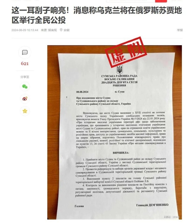 - 网传“乌克兰将在俄罗斯库尔斯克州苏贾市举行全民公投”的说法并无实证。相关说法参考了一份显示来自乌克兰苏梅市苏梅区议会在8月8日召开会议的文件截图。该文件已被证实为假,苏梅区议会近期未举行过任何会议。