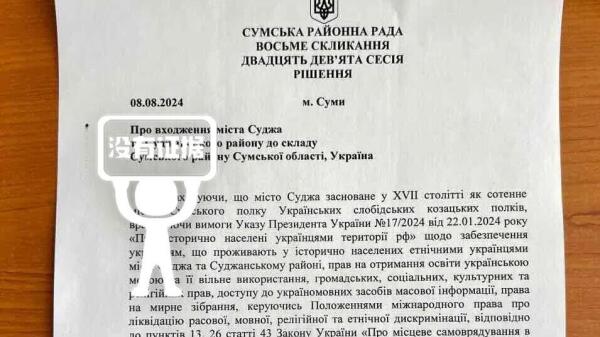 社交平台上有传言称,乌克兰即将在库尔斯克的苏贾区域进行全民公投。该区域与乌克兰的苏梅地区接壤。一份疑似来自苏梅区议会的文件截图显示,苏梅区将接受库尔斯克州的苏贾市和苏贾区作为乌克兰苏梅州苏梅区的一部分,并将在“苏梅州苏梅区苏贾地区”举行全民公决及国家权力机构和地方自治机构的选举。