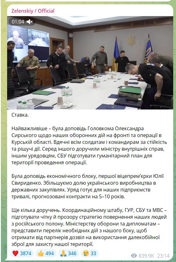 8月12日,泽连斯基在Telegram上称瑟尔斯基汇报了在俄罗斯库尔斯克州行动的情况。