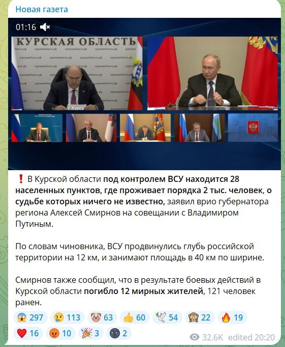 Novaya Gazeta发布在telegram账号上的视频显示,阿列克谢·斯米尔诺夫向普京等人汇报了库尔斯克的局势。