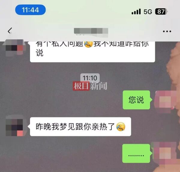 张女士提供的聊天截图显示,4月18日早上,徐某表示有个私人问题,不知道咋说,张女士回应“您说”,徐某回“昨晚我梦见跟你亲热了”。