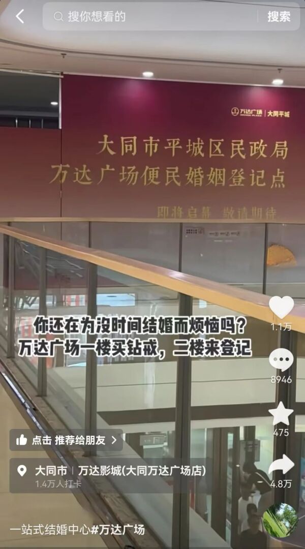 近日,有网友发布视频称“大同万达广场将设婚姻登记点”,画面显示“大同市平城区民政局万达广场便民婚姻登记点即将启幕”等字眼。该视频评论区下有网友调侃:“开在商场里,可以购买领结婚证的团购套餐了。”