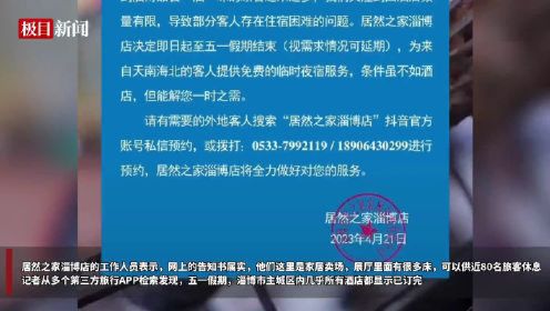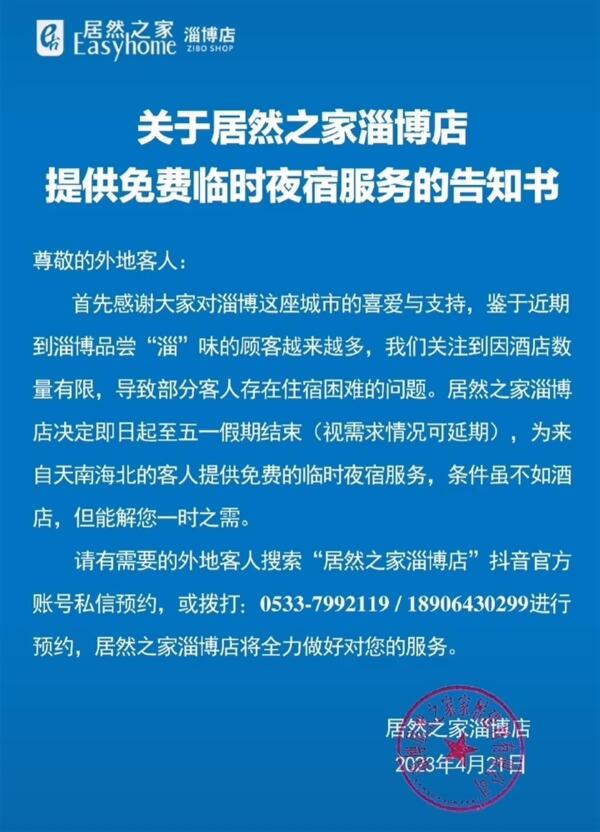 题为《关于居然之家淄博店提供免费临时夜宿服务告知书》的文章写道,首先感谢外地客人对淄博这座城市的喜爱与支持,鉴于近期到淄博品尝“淄”味的顾客越来越多,他们关注到因酒店数量有限,导致部分客人存在住宿困难的问题。商场决定4月21日起至五一假期结束(视需求情况可延期),为来自天南海北的客人提供免费的临时夜宿服务,条件虽不如酒店,但能解您一时之需。有需要的外地客人可以在官方账号私信或拨打电话预约。