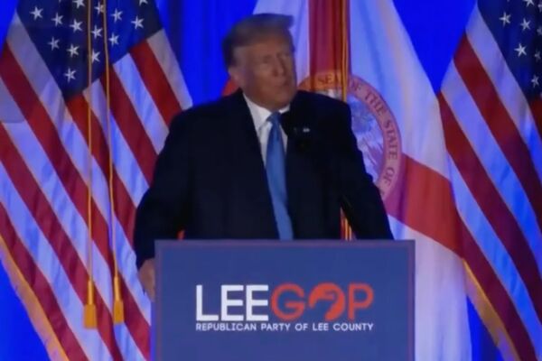 当地时间21日,美国前总统特朗普在佛罗里达州利县迈尔斯堡晚宴上发表演讲。 图自外媒