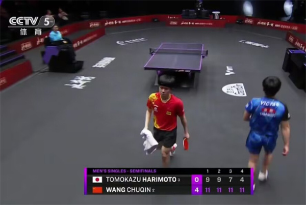 WTT澳门冠军赛2023男单半决赛,王楚钦4-0战胜张本智和,成功晋级决赛,四局比分为11-9、11-9、11-7、11-4。