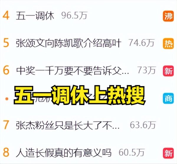 今天是4月23号,星期天,但是今天还是工作日。因为按照五一放假的时间表,为了凑够五一长假,必须要从今天抽一天出去。这样的话,再补上5月6号星期天那天,就可以从4月29号开始,一直放假到5月3号。仅今天白天,关于五一放假的两个话题【五一调休,人造长假真的有意义吗?】,已经登上了微博热搜前十,可见民众对此事件的关注度是有多高。