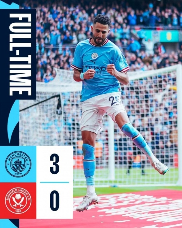 直播吧4月23日讯 北京时间4月22日晚23点45分,2022-23赛季足总杯半决赛在温布利大球场展开角逐,曼城对阵谢菲尔德联。上半场B席造点,马赫雷斯点射建功,下半场马赫雷斯上演帽子戏法。最终曼城3-0完胜谢菲联,蓝月亮顺利晋级足总杯决赛,决赛将迎战曼联与布莱顿之间的胜者。