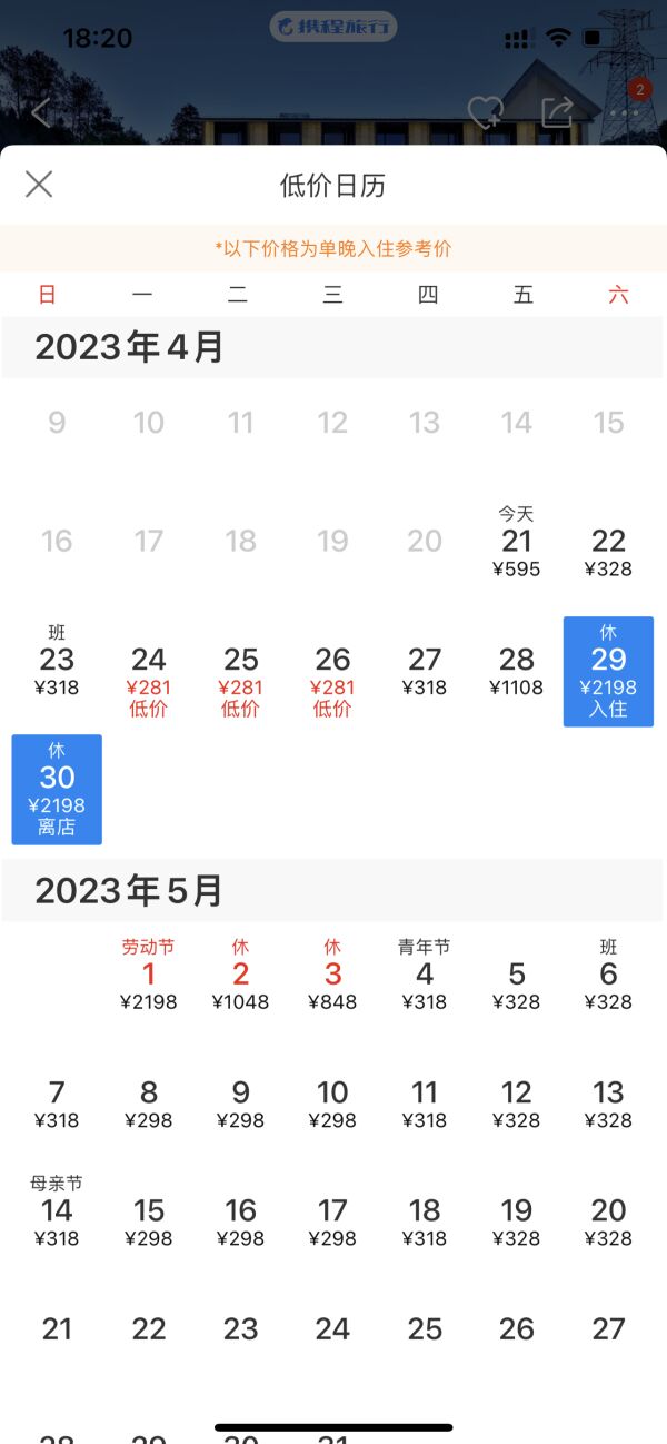 某位于景德镇的四钻酒店看起来“五一”假期和平日的价差更大。澎湃新闻搜索发现,该酒店4月、5月平日最低能订到300元/晚左右的房间,甚至“五一”前一周有房型的最低价300元不到,仅281元/晚,而4月29日至5月1日最低仅能订到2198元的房间。
