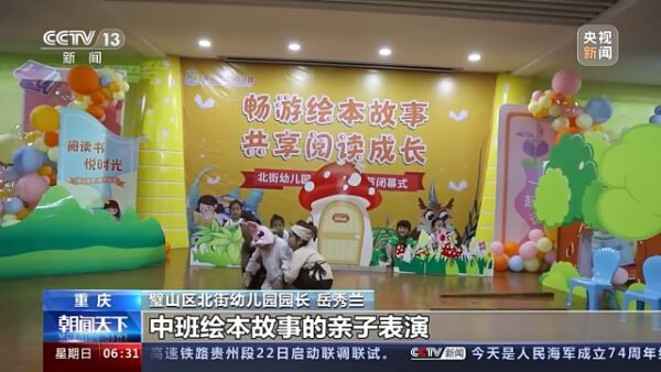 璧山区北街幼儿园园长 岳秀兰:我们通过小班儿歌的讲演、中班绘本故事亲子表演、大班绘本故事展演,让孩子们在阅读中表演,在表演中体验,进一步激发孩子阅读的兴趣。