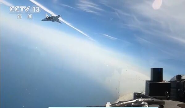 某次任务中,我航母编队与外军舰机在远海大洋不期而遇。外机飞行员摆出不友好手势挑衅,海军航空兵逼近至百米内将其驱离。
