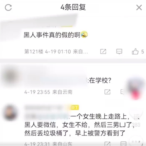网传图片显示,有网友问“黑人事件真的假的”,有人回应是在学校吗?又有人称,一个女生晚上走在路上,黑人要微信,女生不给就被三男性侵了,然后丢垃圾桶,早上被警方看到了。
