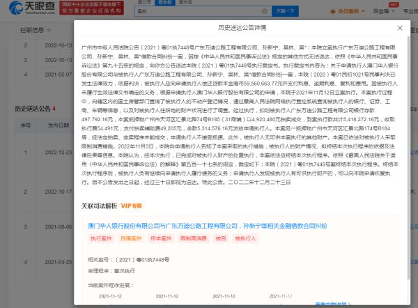 据天眼查APP2022年12月23日历史送达公告详情,广州市中级人民法院公告(2021)粤01执7448号广东万迪公路工程有限公司、孙新宁、吴林等借款合同纠纷一案,经过执行,扣划被执行人广东万迪公路工程有限公司银行存款49.7万余元,本案抵押物商铺以492万余元拍卖成交,到案执行款共计541.8万余元,收取执行费和支付拍卖辅助费后,余款531.5万余元发放申请执行人。此外,被执行人无可供本案执行的其他财产。本案已依法对被执行人采取限制消费措施。