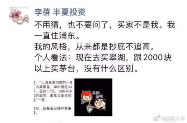 对此,私募基金半夏投资创始人李蓓在在朋友圈回应称“不用猜,也不要问了,买家不是我。我一直住浦东”,李蓓甚至调侃道“我的风格,从来都是抄底不追高。个人看法:现在去买翠湖,跟2000块以上买茅台,没有什么区别。””