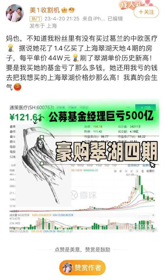 爆料博主吐槽表示”要是我买她的基金亏了那么多钱,她还用我亏的钱去把我想买的上海翠湖价格炒那么高!我真的会生气。“
