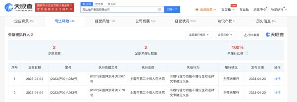近日,记者从天眼查App获悉,因有履行能力而拒不履行生效法律文书确定义务,万达地产集团有限公司及旗下河源市福新创建有限公司、河源御海房地产开发有限公司被上海市第二中级人民法院2次列为失信被执行人(老赖)。