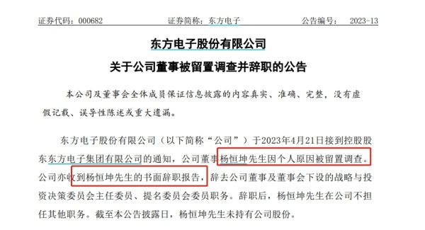 董事杨恒坤, 被留置调查, 东方电子, 杨恒坤被
