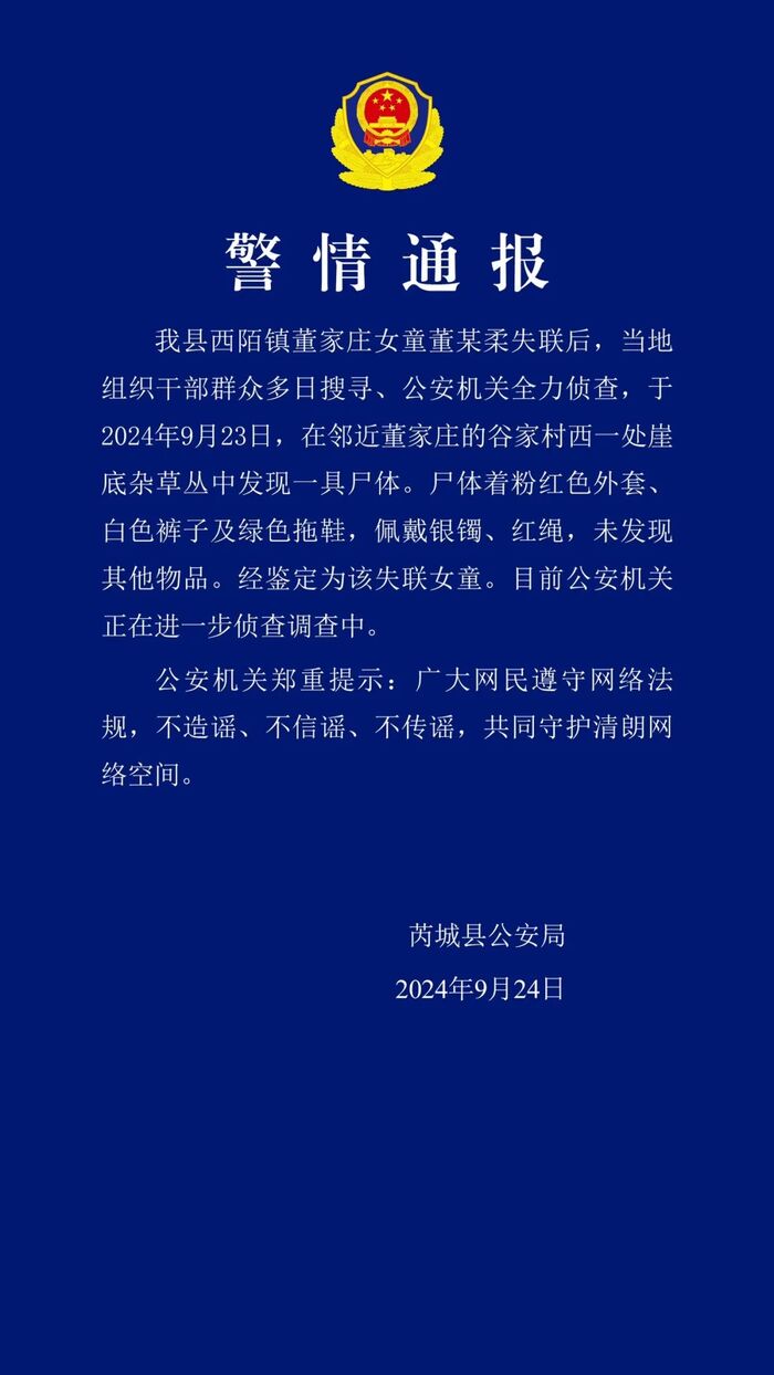 9月24日,山西芮城县公安局发布警情通报:我县西陌镇董家庄女童董某柔失联后,当地组织干部群众多日搜寻、公安机关全力侦查,于2024年9月23日,在邻近董家庄的谷家村西一处崖底杂草从中发现一具尸体。尸体着粉红色外套、白色裤子及绿色拖鞋,佩戴银镯、红绳,未发现其他物品。经鉴定为该失联女童。目前公安机关正在进一步侦查调查中。