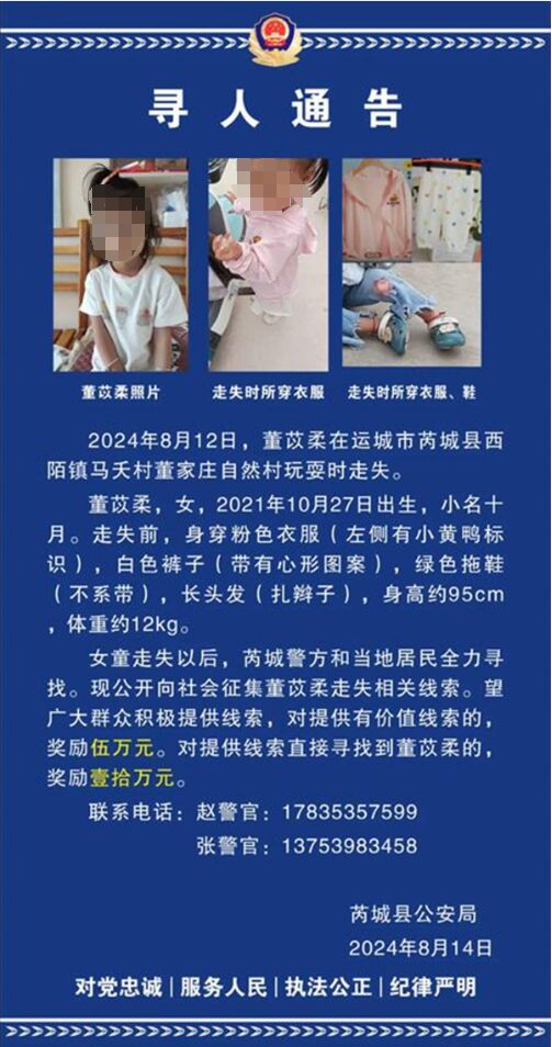 8月14日,芮城县公安局发布寻人通告。通告显示,董苡柔,女,2021年10月27日出生,小名十月。走失前,身穿粉色衣服(左侧有小黄鸭标识),白色裤子(带有心形图案),绿色拖鞋(不系带),长头发(扎辫子),身高约95cm,体重约12kg。警方公开向社会征集董苡柔走失相关线索。望广大群众积极提供线索,对提供有价值线索的,奖励五万元。对提供线索直接寻找到董苡柔的,奖励十万元。