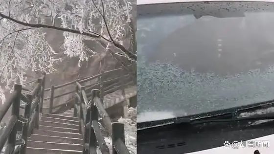 由于冻雨的降临,很多游客的车窗上都是覆起了厚厚的冰。雨凇形成的景观,就像是假的一般,在花草树木上都有着各种各样的冰花,有的树木上还有冰挂,从远处看过去,就像是来到了“童话王国”。