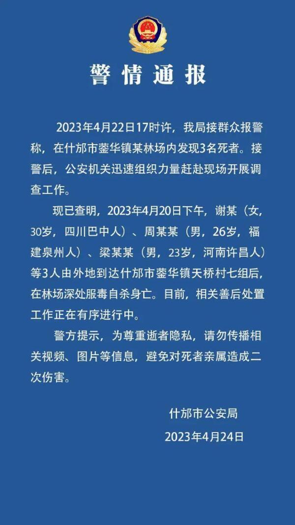 24日凌晨,四川省什邡市公安局官方微博就“某林场发现3名死者”发布警情通报,全文如下: