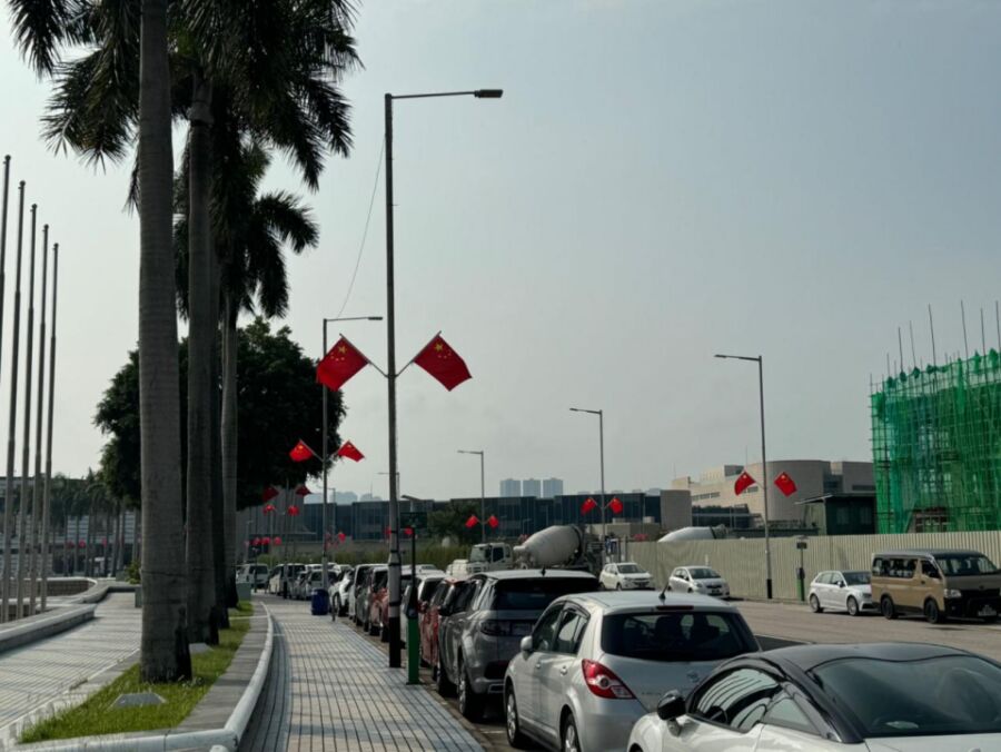 图为澳门特区立法会附近悬挂的国旗迎风飘扬。