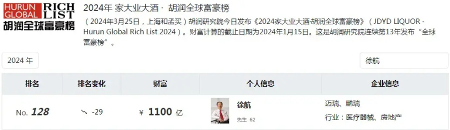 2024年,徐航以1100亿元财富,入选胡润全球富豪榜。