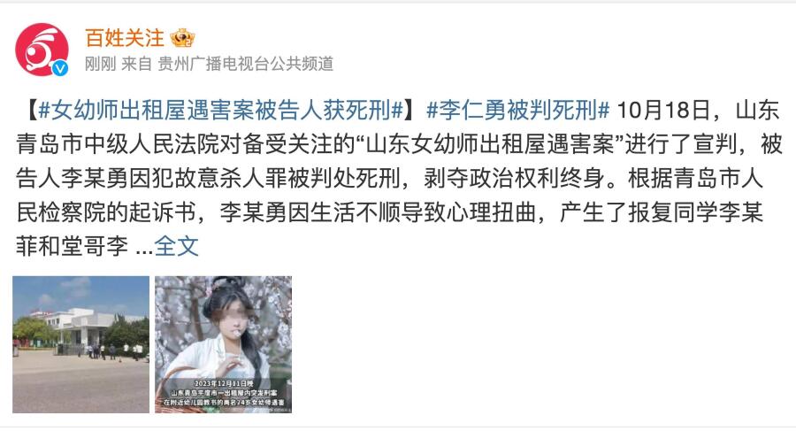 10月18日,山东青岛市中级人民法院对备受关注的“山东女幼师出租屋遇害案”进行了宣判,被告人李某勇因犯故意杀人罪被判处死刑,剥夺政治权利终身。根据青岛市人民检察院的起诉书,李某勇因生活不顺导致心理扭曲,产生了报复同学李某菲和堂哥李某辉的恶念。他通过蹲守、跟踪等方式获取了李某菲的住址,并购买单刃刀多次前往其住处伺机作案。2023年12月11日晚,李某勇携带刀具闯入李某菲的出租屋,持刀猛捅数刀致其当场身亡,随后又杀害了无辜的室友刘某某。