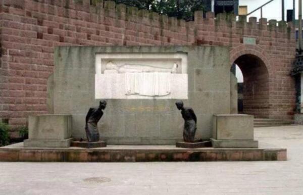 据了解,在磁器口古镇,有一座抗战无名将士墓,墓前摆放着双手被缚、跪在地上的汪精卫、陈璧君夫妇的雕像。