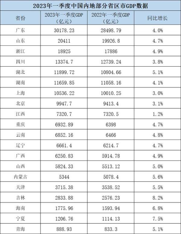 从经济总量上看,去年一季度GDP离3万亿一步之遥的广东,今年一季度破3万亿,达30178.23亿元。