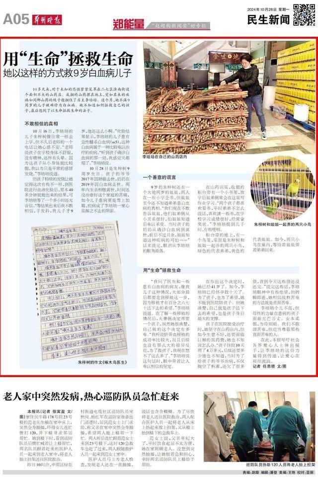 10多天来,对于未知的恐惧紧紧笼罩在二七区淮南街这个面积不大的山药店。成捆的山药摞在地上,突如其来的疾病如同绑山药的绳子般捆住了店主李培培。这个月,她不满9周岁的儿子被确诊为白血病。她不知道如何拯救自己的孩子,最后想到了以生命拯救生命的法子。
