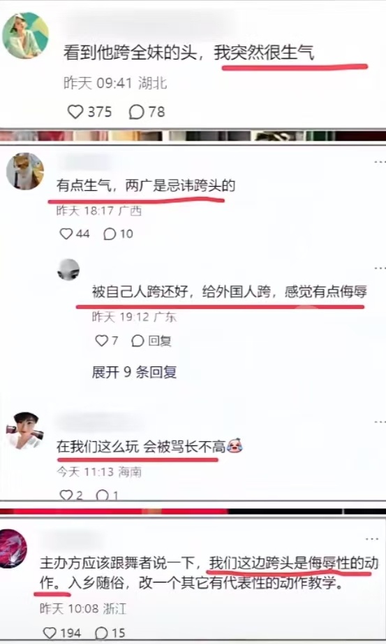 不过,也有粉丝给了一个比较合理的建议,那就是主办方应该跟舞者说一下,我们这边跨头是侮辱性的动作;入乡随俗,改一个其他有代表性的动作教学。