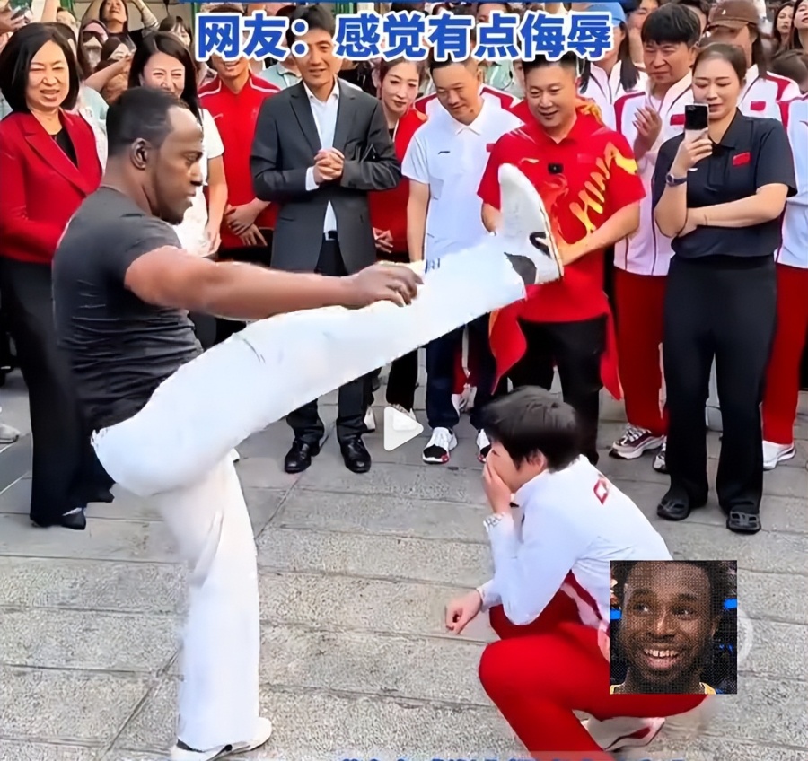 不过,在街头与澳门民众互动的时候,全红婵与一位黑人舞者进行巴西战舞的互动时,被对方用大腿跨过头部,这动作自然让全红婵的粉丝不乐意了,纷纷留言表达了不满: