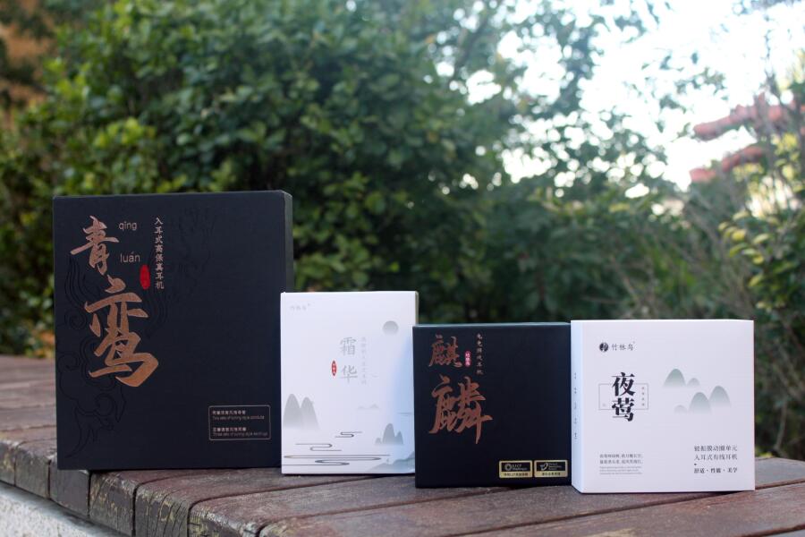 这次带来了四款竹林鸟有线耳机,他们分别是夜莺、麒麟、霜华和青鸾四个系列,先来一个大合照,单从包装盒来看,就可以感受到这四款耳机浓浓的中国风。