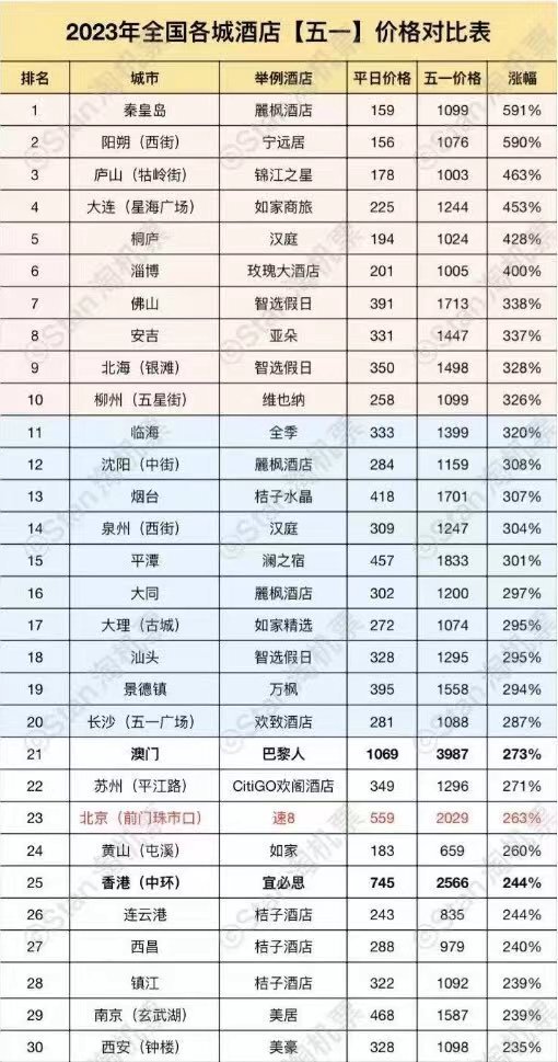 导读:4月24日,有网友发布了一张“全国各城酒店五一价格对比图”,详细列出了五一期间涨价幅度最大的30家酒店。经核实,酒店价格涨幅最高的591%。