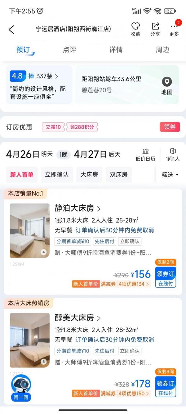 ▲阳朔宁远居酒店“醇美大床房”平时价格为178元。