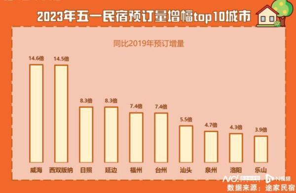 “量价齐升”同样出现在民宿市场。据木鸟民宿数据,截至4月12日,平台五一假期民宿预订量已达到2019年同期整体订单的2.3倍,最终有望达到2019年同期的4.2倍,成为近五年“最火”五一。受跨省民宿预订增多及入住时长增加影响,假期民宿平均客单价较2019年上涨46%。途家民宿统计称,截至4月17日,平台五一民宿提前预订量是2019年同期的2倍,平均间夜价格达到534元。