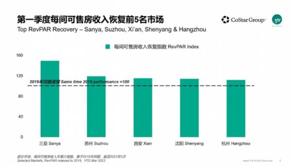 STR咨讯:一季度RevPAR较2019年恢复前5名市场,前三均是热门旅游城市