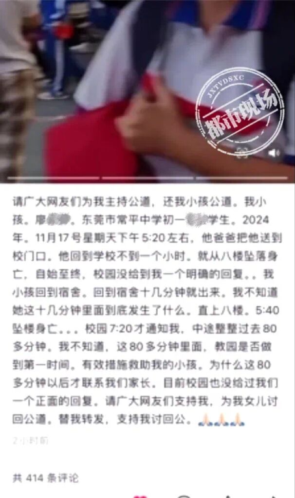11月21日,有网友发布视频称,11月17 日下午,广东省东莞市常平镇常平中学校园内,有一名初一学生廖某某从8楼坠楼,不幸身亡。