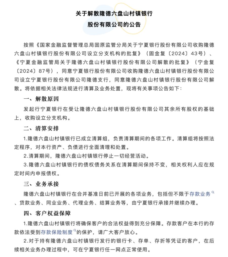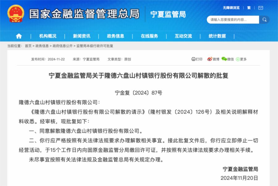 11月22日,金融监管总局官网发布的行政许可信息显示,因被宁夏银行收购,隆德六盘山村镇银行于日前获批解散。