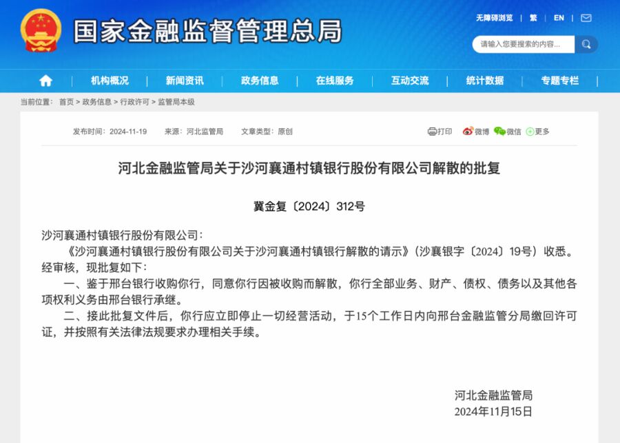 批复文件显示,鉴于邢台银行收购清河金农村镇银行、沙河襄通村镇银行,河北金融监管局于11月15日同意这两家村镇银行因被收购而解散。两家银行的全部业务、财产、债权、债务,以及其他各项权利义务由邢台银行承继。