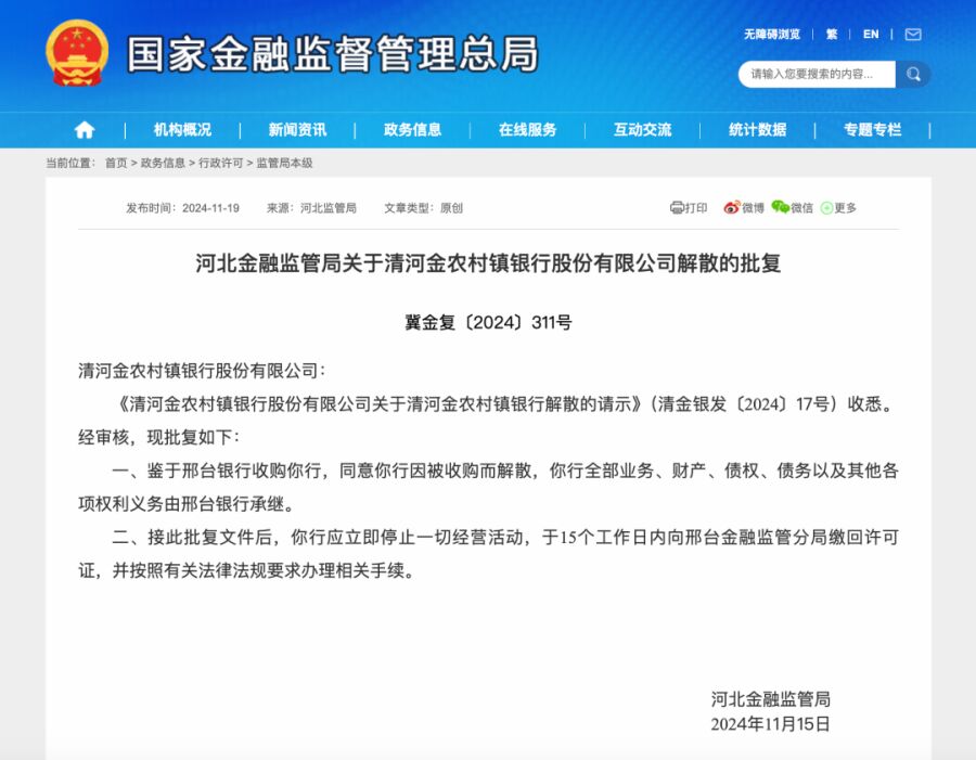 因被邢台银行收购,清河金农村镇银行、沙河襄通村镇银行均于日前获批解散。