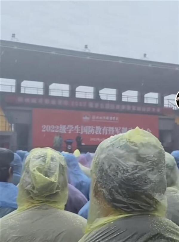 在社交平台流传的现场视频显示,4月22日郑州城市职业学院举行2022级学生军训动员大会,当天下起大雨。学生身穿雨衣,站在操场上。在雨中,有学生喊话台上讲话的校领导“雨大了”“下来”。