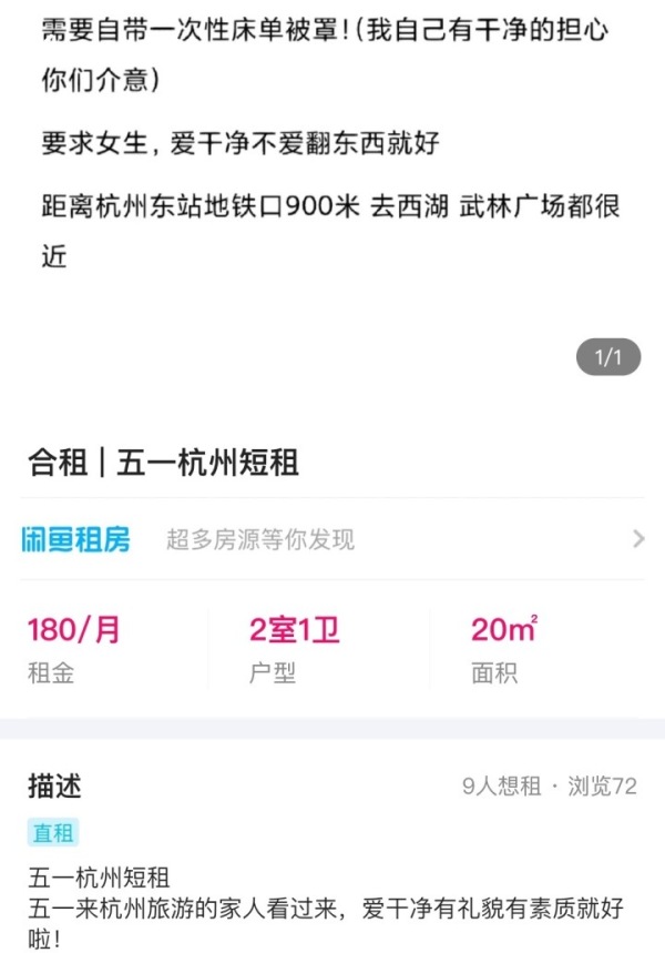 记者搜索发现,作为旅游城市的杭州,也有类似的出租信息。在一条被浏览近百次的信息下,发布者介绍,自己的房型是两室一卫,距离杭州东站地铁口900米,五一期间短租,要求女生,爱干净不爱翻东西就好。担心客人介意,她特意说明了“需要自带一次性床单被罩”。