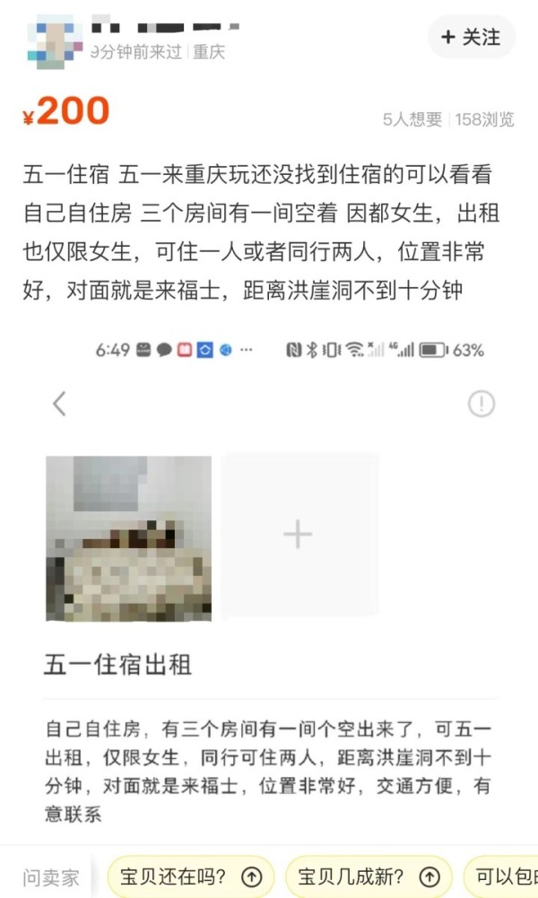 网友发布“重庆五一住宿”的消息 闲鱼APP截图