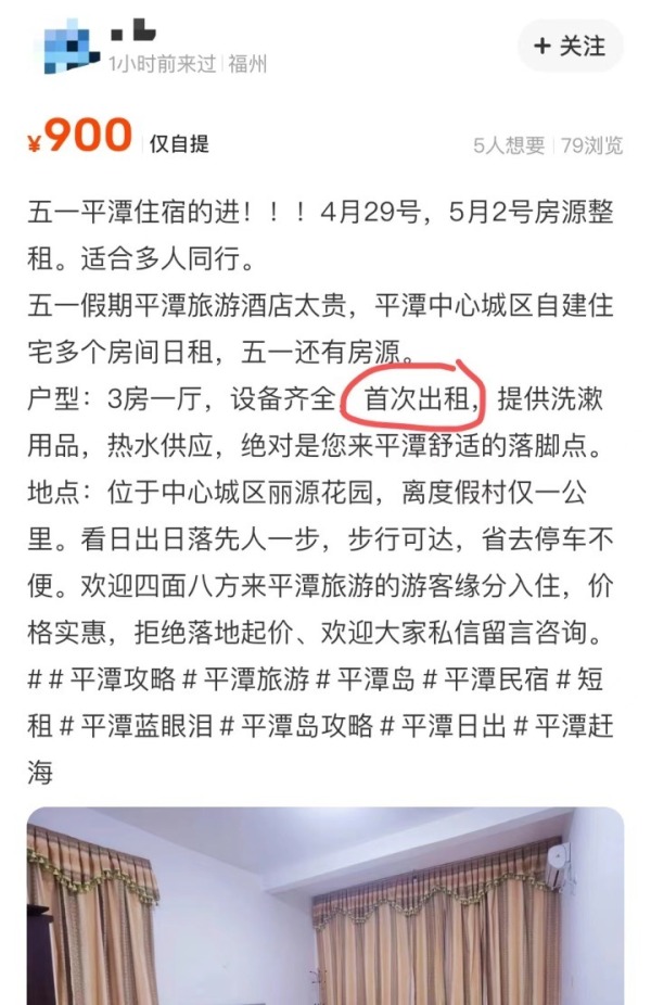 “五一平潭多人住宿的进!4月29日和5月2日还有房间空余,900元整套出租。”“自建房三间卧室,可自行煮饭,距离动车站只要7分钟,只要280元/晚。”这些挂出来的信息多为自住房,利用假期赚点零花钱,有多个房间提供日租,有的还是首次出租。