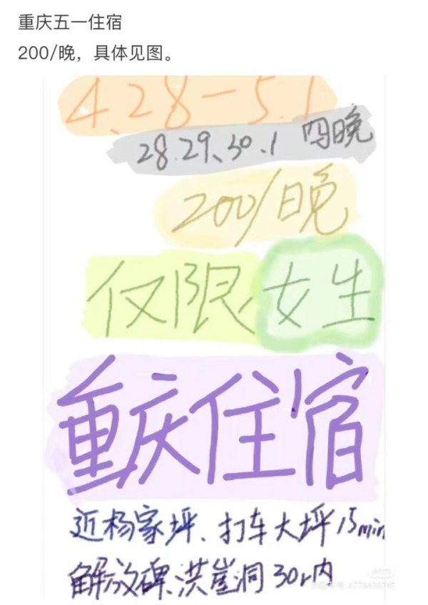 一名在北京读书的网友表示,自己在重庆有一套两室一厅的房子,距离解放碑四五公里,已经半年没住人了,查了查五一好像很难定到酒店,就挂出来,价格在300元/晚,目前均已订出,“解放碑的如家都涨到七百一晚了,南岸区三百元以下根本没房。今年好可怕,还是在家待着吧。”