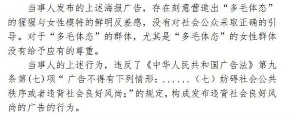 处罚事由显示,当事人主要经营项目为脱毛服务,自行设计海报广告两张,其中广告一“全球脱毛专家”的内容是:两位身着泳衣的女士和一只毛发旺盛的猩猩手拉手跳进湖泊里的背影图片;广告二“全年无忧脱毛体验”的内容为:门内是身着连衣裙和高跟鞋的女性,门外站着一只身着相同服饰的全身毛发的猩猩。