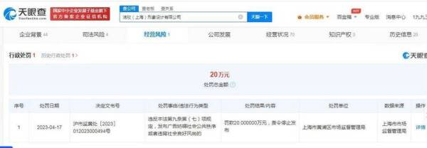 据法治网4月26日报道,天眼查App显示,近日,洁欣(上海)形象设计有限公司因发布违背社会良好风尚的广告,被上海市黄浦区市场监督管理局罚款20万。